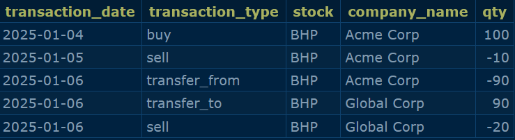 When shares are sold we can choose which parcels to sell first (or even split it across several parcels) so a parcel may be interacted on by many different operations. One such operation is a transfer, where a parcel may be either wholly or partially transferred to a different company. This leads to the creation of a new parcel.